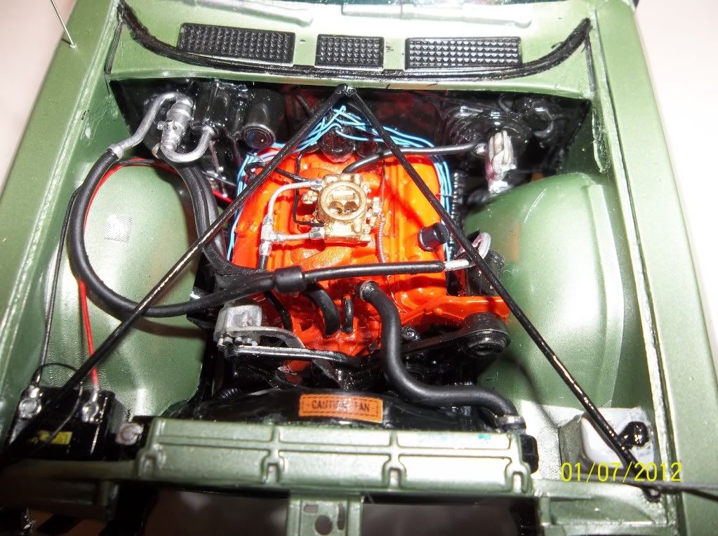 This AMT chevy uses the every thing but the body from the AMT 70 MonteCarlo.The engine is wired and plumbed,parts box wheels and tires,custom mix of testors colors applied with an airbrush to get the frost green color.I was going blind trying to get the mix just right.